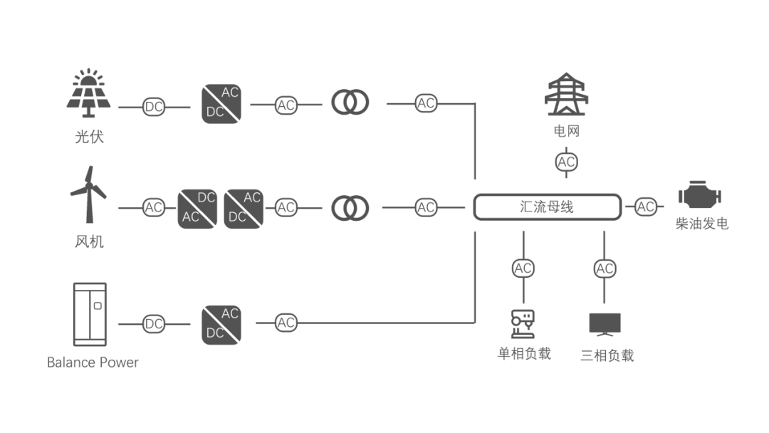 Balance Power應用場景覆蓋削峰填谷、備用電源、動態增容及余電消納,覆蓋電量100度~300度的用戶需求,可以接入風機逆變器、光伏逆變器,以及柴發在交流側并機組成微網,也可以與電網進行并網運行。
