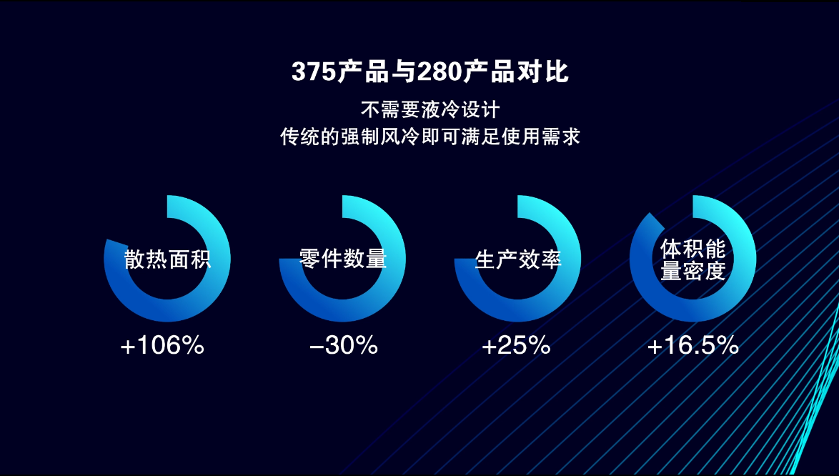 相比現(xiàn)有的280Ah產(chǎn)品,375Ah產(chǎn)品散熱面積提升了106%,無(wú)需液冷設(shè)計(jì),傳統(tǒng)的強(qiáng)制風(fēng)冷即可滿足使用需求;